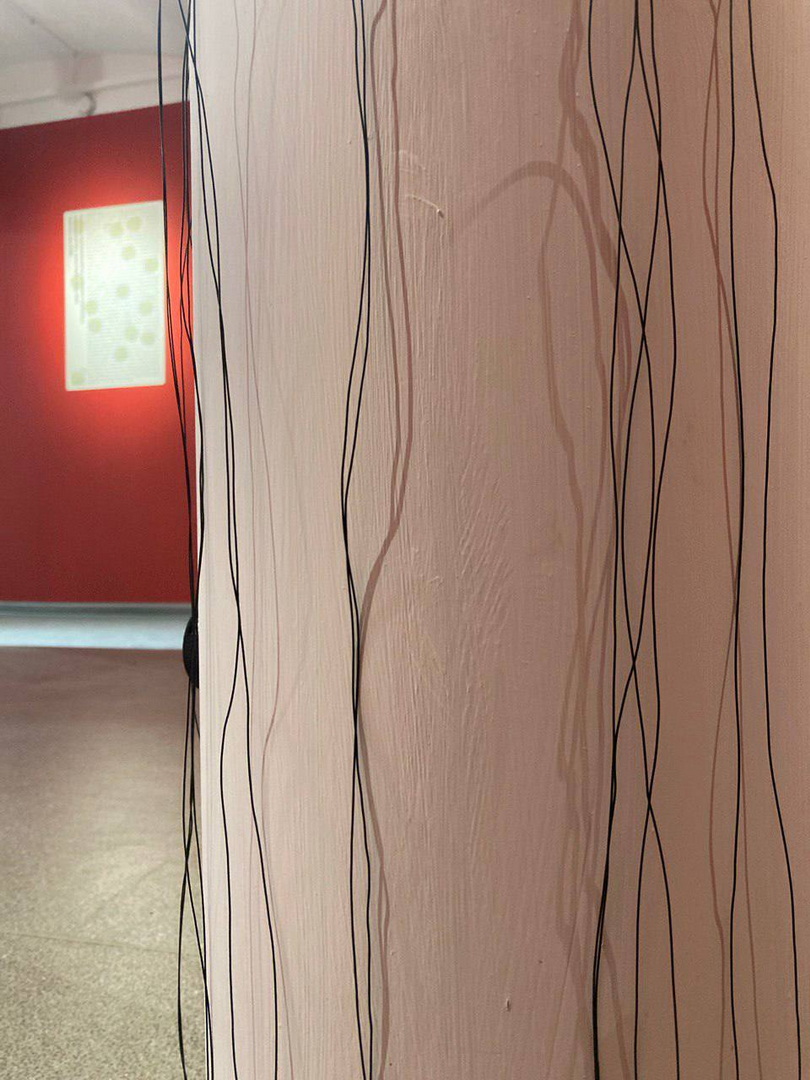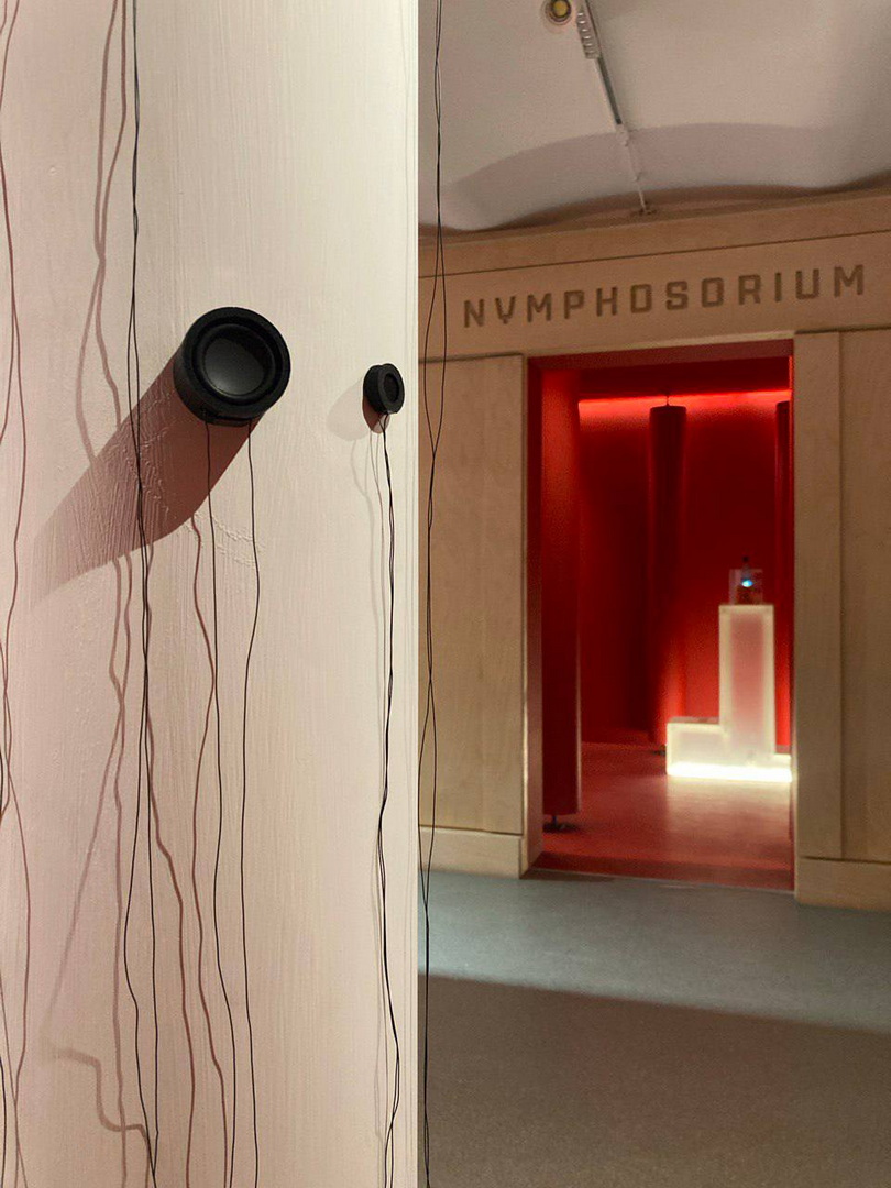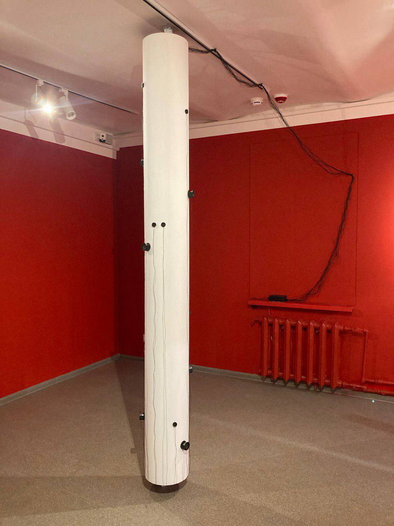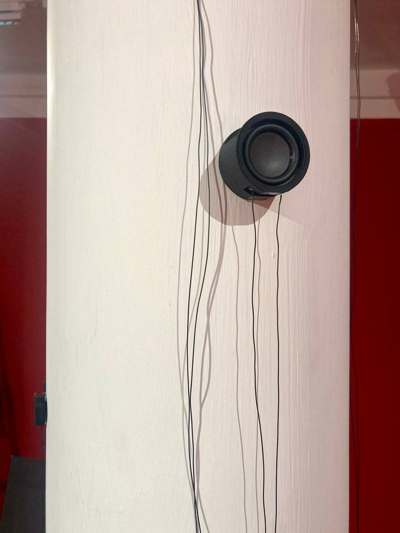 Проект посвящен пространству яблоневого сада: здесь слышны шаги садовода, жужжание пчел, шум ветра в листве, стук о землю созревших плодов и разные другие звуки, связанные с жизнью сада. Свободно спускающиеся провода питают динамики, которые расположились на колонне следуя логике растительного мотива. Работая попеременно, они создают вокруг себя живое пространство.